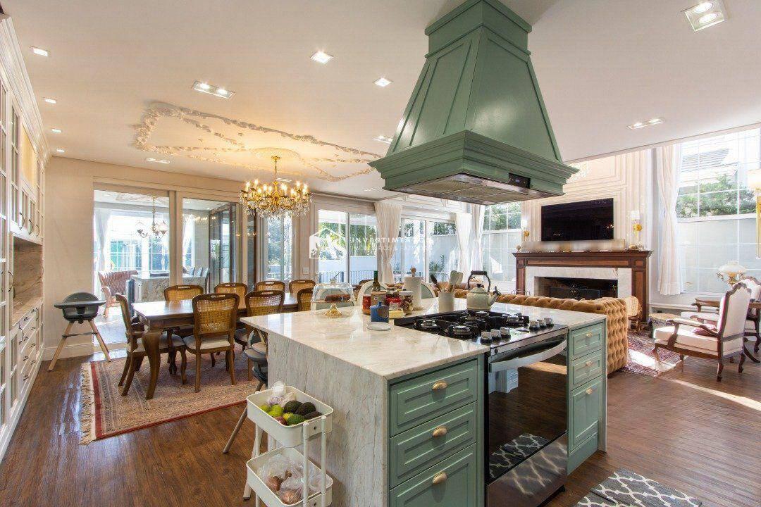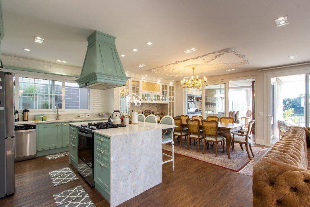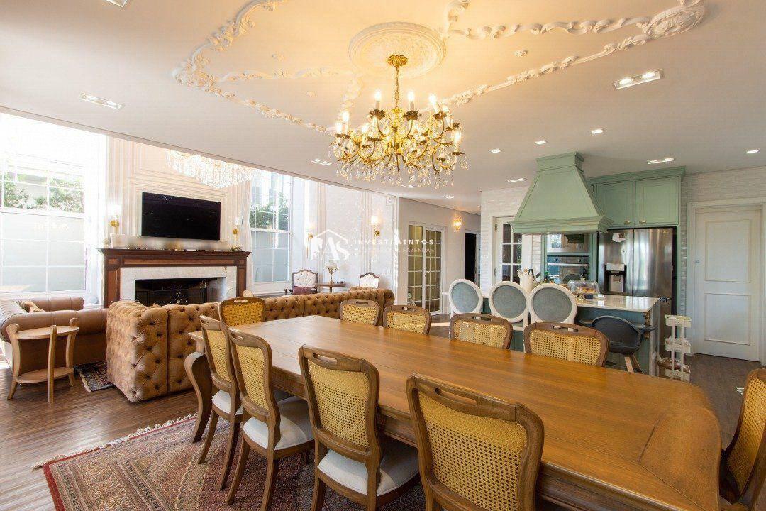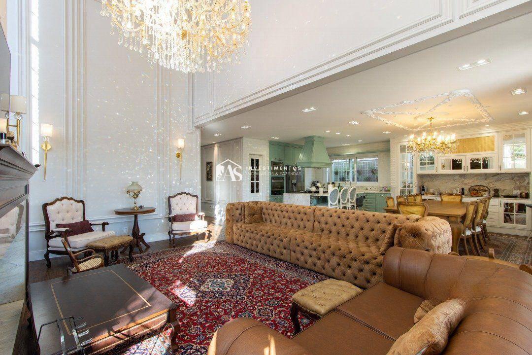 Espaços Integrados: A sala de estar, jantar e a cozinha são totalmente integradas, criando um ambiente amplo e convidativo. A sala de estar se destaca com seu maravilhoso pé direito alto e um lustre de tirar o fôlego.