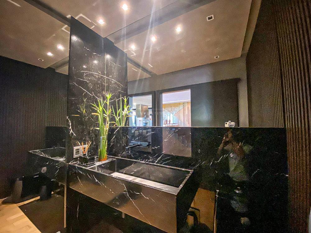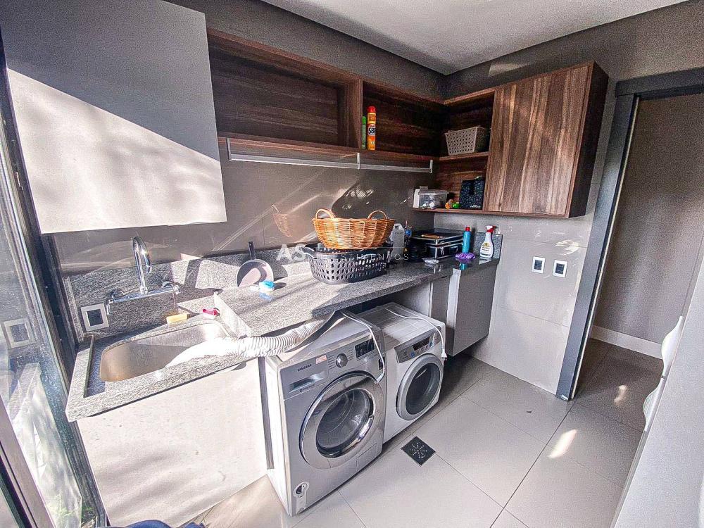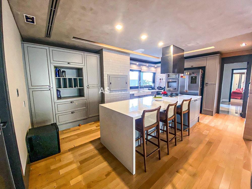 O hall de entrada com porta em madeira pivotante dá as boas-vindas com elegância e sofisticação, enquanto a cozinha auxiliar para uso diário oferece praticidade e funcionalidade.