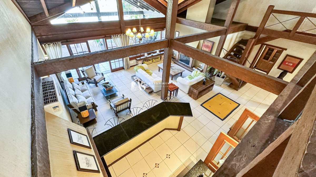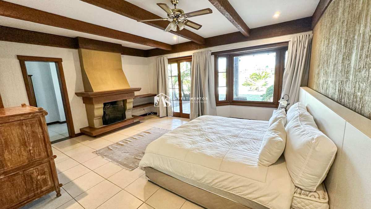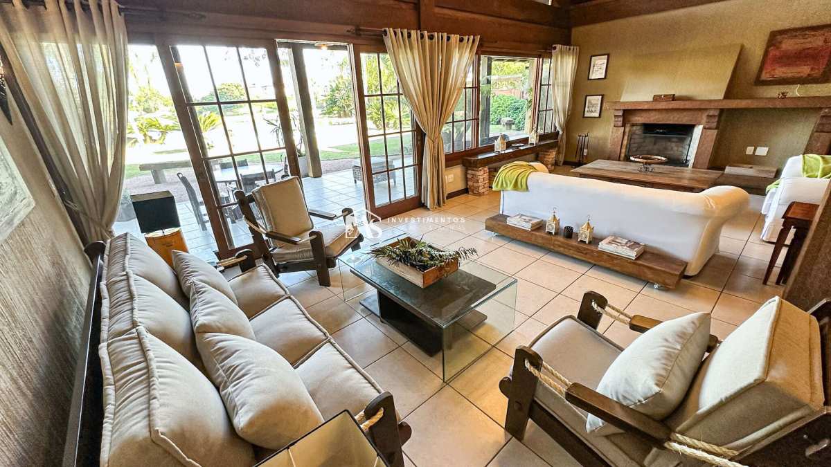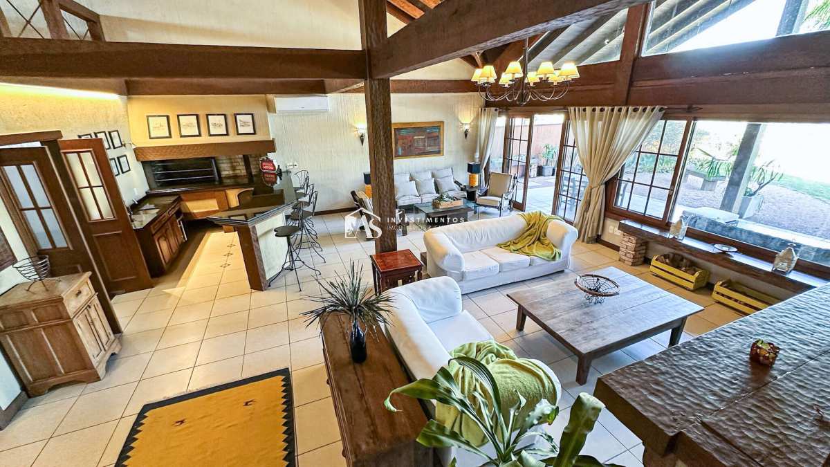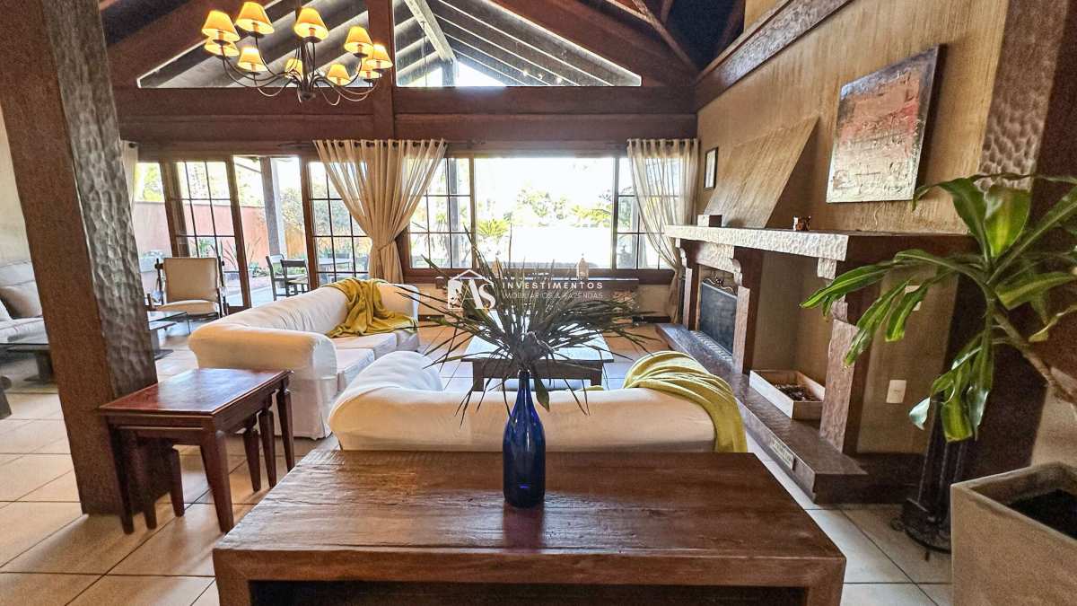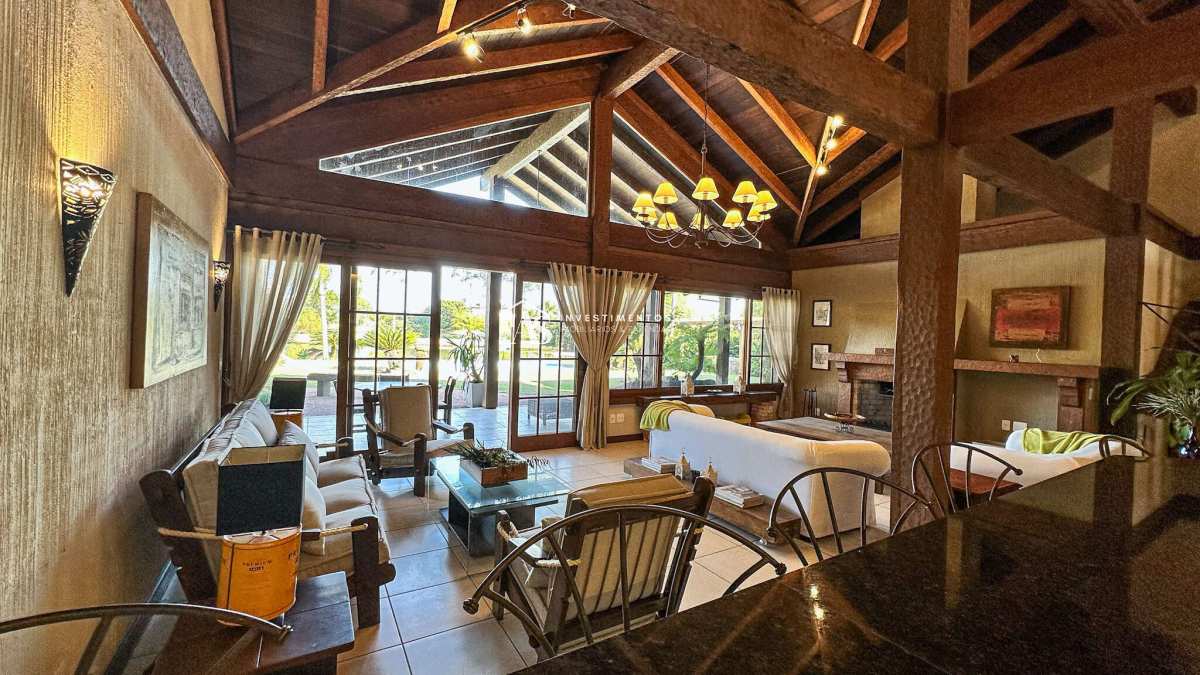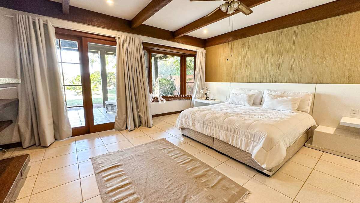 Com uma área construída de 596 m2, a casa dispõe de 4 suítes luxuosas, sendo 2 delas equipadas com banheira de hidromassagem e uma suíte para hóspedes.