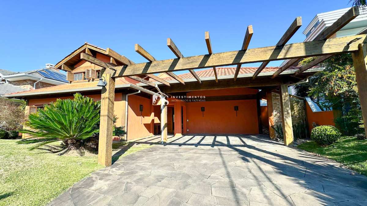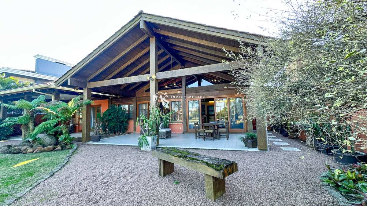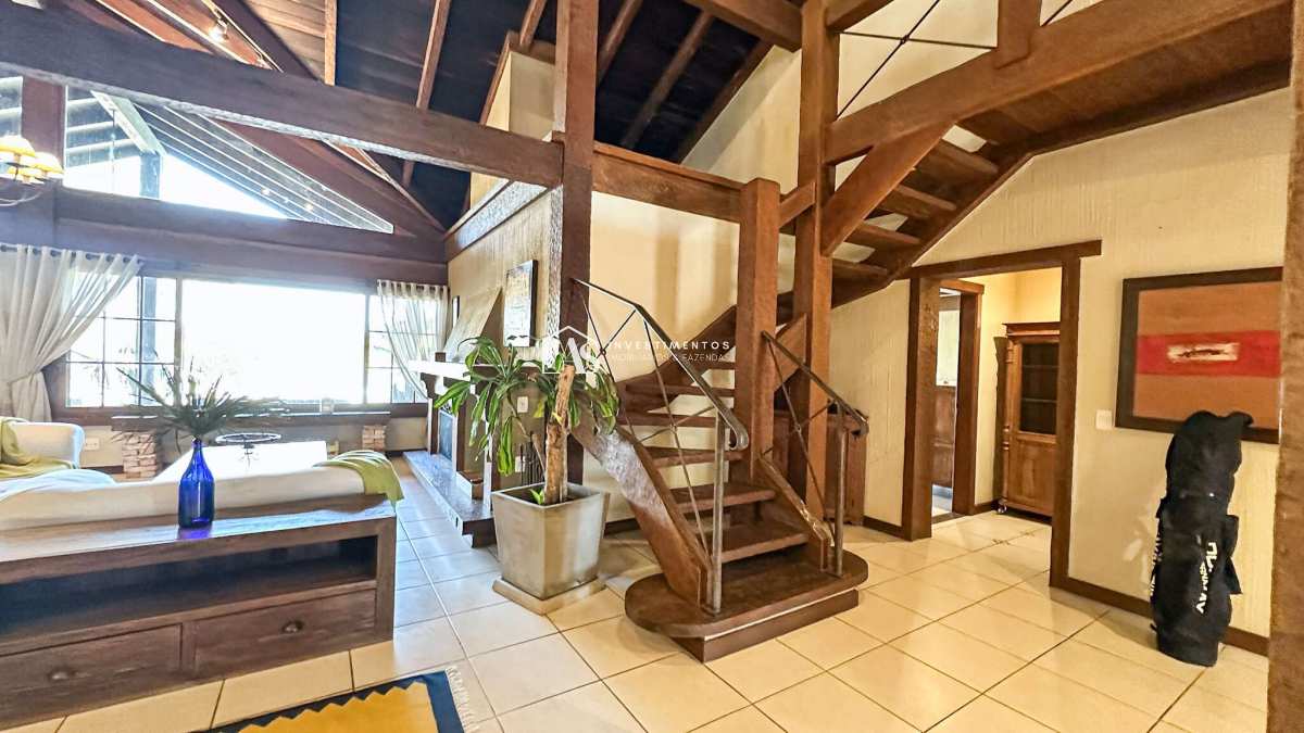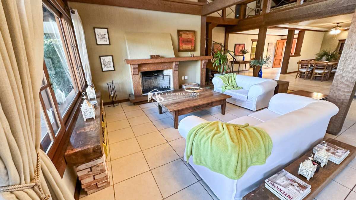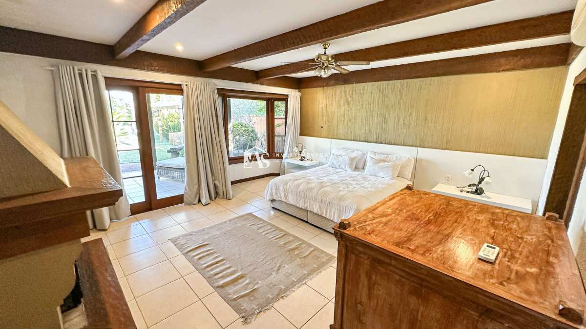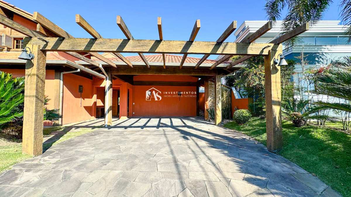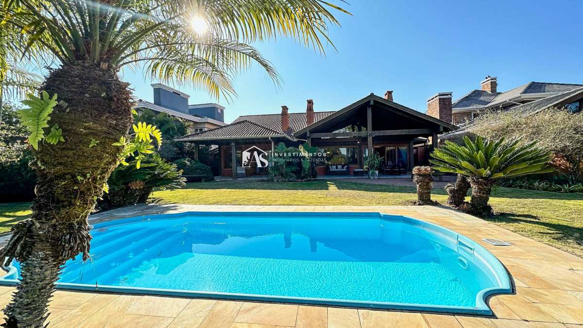 Com uma área construída de 596 m2, a casa dispõe de 4 suítes luxuosas, sendo 2 delas equipadas com banheira de hidromassagem e uma suíte para hóspedes.